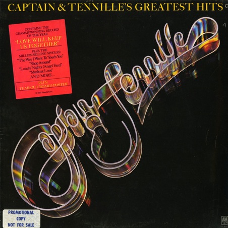 So, I have sealed copy of this 70’s jewel. First, there’s the gatefold jacket – essential for the 70’s teen, and handy if you misplaced your copy of Yes’ “Tales From Topographic Oceans.” (Personally, given the choice of listening to either album, I’m opting for the confectionary leanings of C&T over the meandering indulgences of Yes, but if you decide to use that jacket for rolling purposes, just know you’ll be looking at a shirtless Daryl Dragon.) Other built-in features of this fine collection are a very large custom sticker letting you know that all those songs you wanted to hear (all killer, no filler!) are enlosed within, as is a “tear-out board poster”. And finally, the small cut-out-hole on the top right corner and the promo sticker on the bottom left would lead me to believe this is a white label promo. Word!