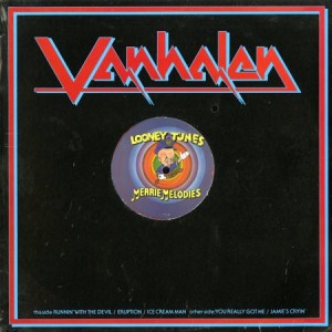 The other item is a sealed (!) promo only Looney Tunes Merrie Melodies 12″ single in a custom die-cut sleeve with five tracks from the first record -“Runnin’ With The Devil”, “Eruption”, “Ice Cream Man”, “YOu Really Got Me” and “Jamie’s Cryin'”. Oh, and it’s on red vinyl. Yep. Jacket has some issues – a corner crease visible when looking at the back of the jacket, a top right crease due to shrink pull and a small bottom right corner dent. So, definitely not perfect, but also not all that bad. And again, it sealed and found here (and price dropped to $75 due to the jacket stuff)…http://www.musicstack.com/item/327848143.